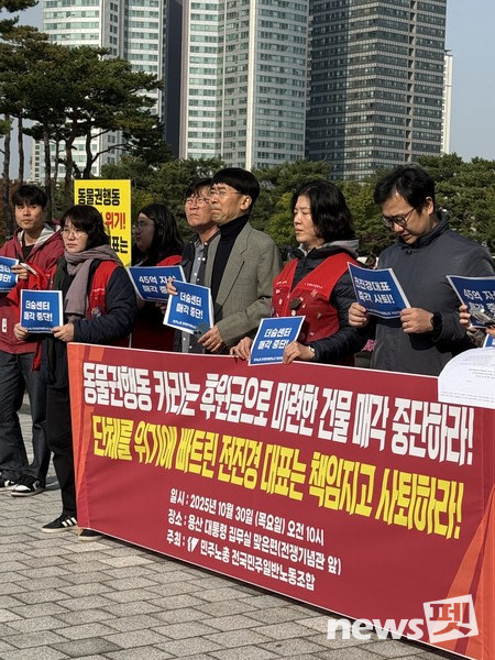 민주노총 전국민주일반노조 서울본부 동물권행동 카라지회(이하 카라지회)는 지난 30일 서울 용산 대통령 집무실 앞에서 기자회견을 열고, 동물권행동 카라 전진경 대표의 즉각 사퇴와 마포 더불어숨센터(카라 사옥) 매각 중단을 촉구했다.