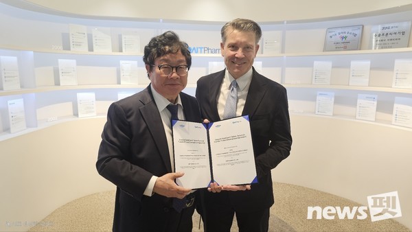 <지난 7일 지엔티파마 곽병주 대표(왼쪽)와 샤넬파마 안젤로 카토 대표가 제다큐어 글로벌 출시 위한 계약서를 들고 기념 사진을 찍고 있다. 사진 지엔티파마>